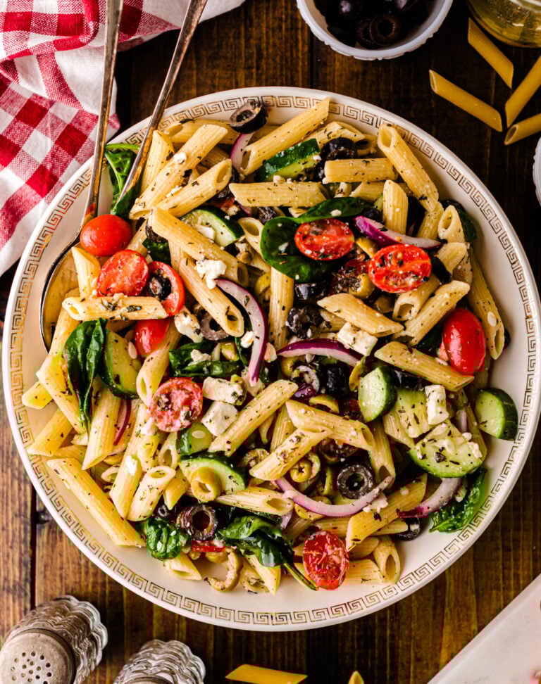 Juicy tomatoes and cucumbers along with salty olives, red onion, tender pasta, and spinach are tossed together with creamy feta cheese in a homemade dressing for a crave-able salad that's so easy to make!