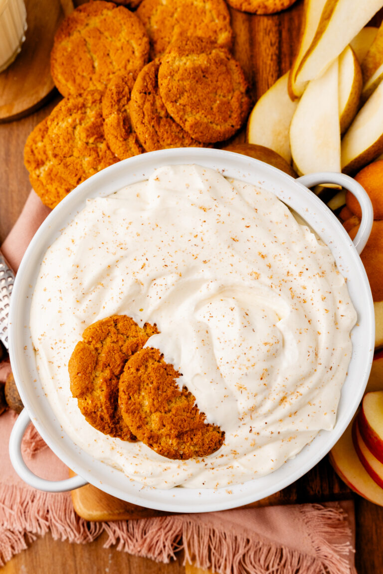 Creamy and fluffy with all the flavors of one of the holiday's favorite flavors, Eggnog Cheesecake Dip is outrageously delicious! This make-ahead treat is perfect to serve at any party, family gathering, or when watching your favorite holiday movie. So grab some fruit and cookies to dip in, and let's make this recipe!