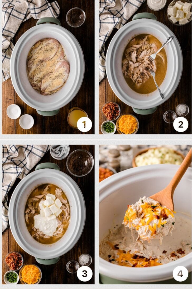 - Remove lid, shred chicken with two forks. Stir in cream cheese and sour cream until smooth and creamy. If you’d like a thicker sauce, stir in cornstarch slurry and cook on HIGH for 10 minutes.
