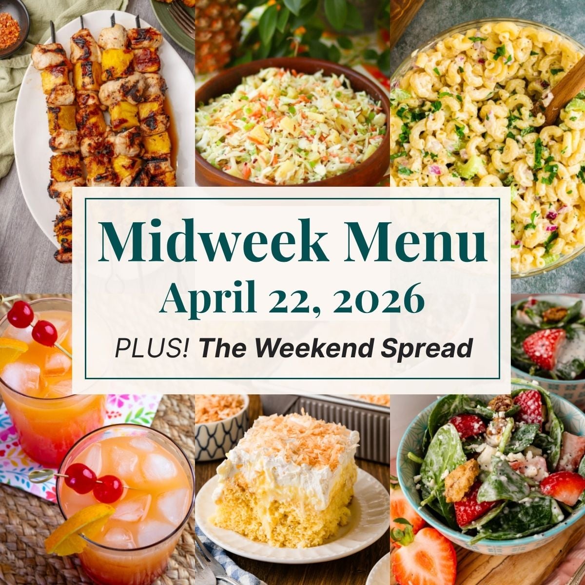 Helping you answer the question: “What’s for dinner?” This week we are making Hawaiian BBQ with grilled pineapple chicken, mac salad, pineapple slaw, and coconut lime rice. Enjoy your tropical-inspired meal with a fresh tequila sunrise cocktail or mocktail and finish off dinner with pineapple coconut poke cake.