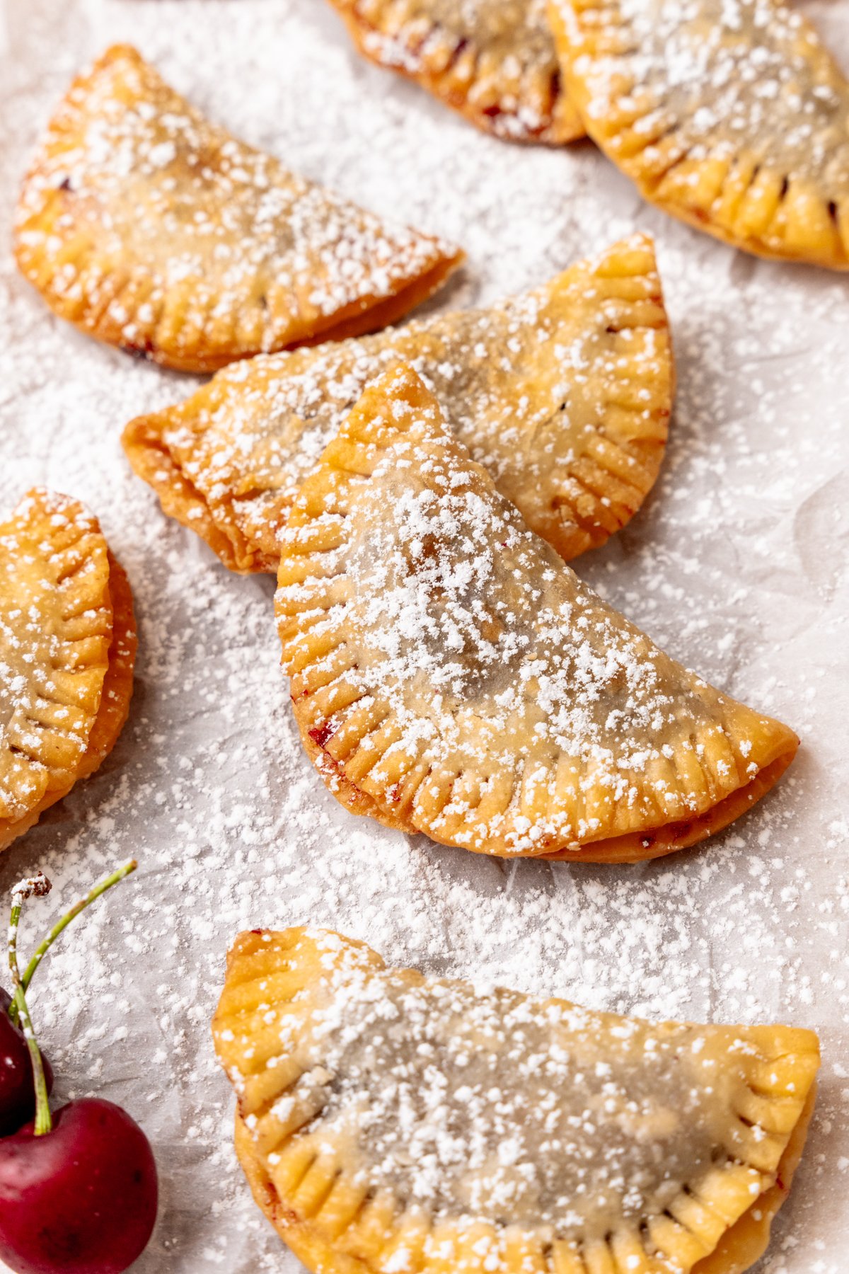 Fried Cherry Pies: Store-bought pie crust saves time and energy! You can prepare and freeze unbaked hand pies! Simply fry them from frozen when you want a tasty dessert!