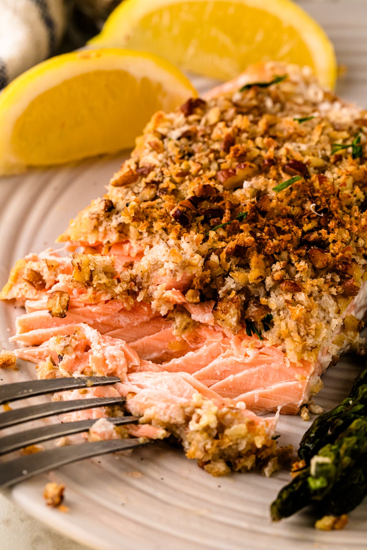 Pecan Crusted Salmon: If you want to meal prep this salmon, I often make the glaze and the crust ahead of time. Then you just have to glaze, coat, and bake the salmon!