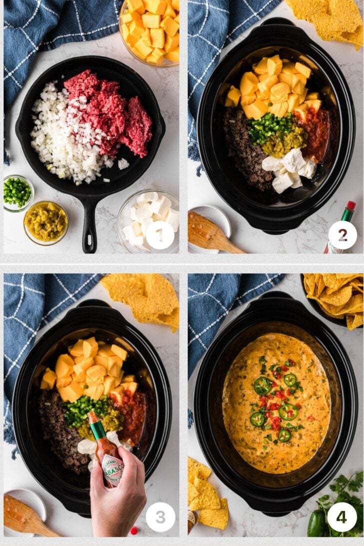 - Add cubes of Velveeta and cream cheese, along with the jalapeño, salsa, green chilies, and hot sauced. Stir ingredients. Place lid on the slow cooker.