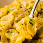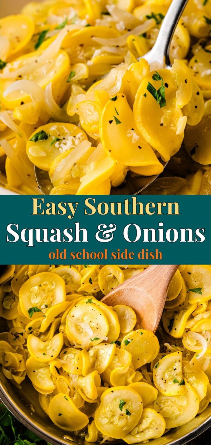 Squash and Onions is a classic Southern dish that perfectly captures summer flavors. Tender yellow squash and sweet Vidalia onions sautéed in butter and perfectly seasoned make a simple, old-school side dish that can be cooked in just 15 minutes!