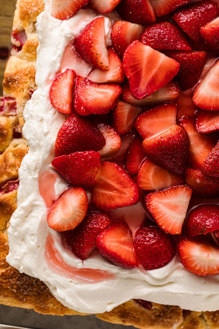 - Spread whipped cream-mascarpone mixture over top of cooled shortcake, leaving edges exposed. Top with strawberry mixture and any accumulated juices. Slice evenly into 12 pieces, and serve immediately.