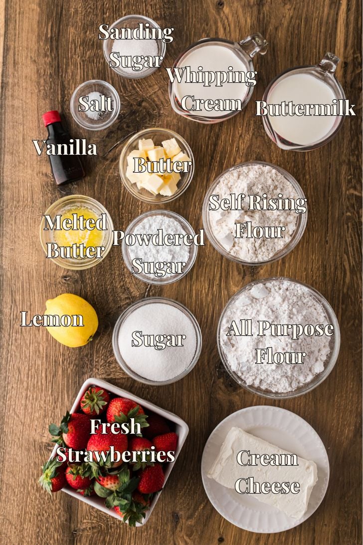 - Preheat oven to 400°F. Coat a 13- x 9-inch rimmed baking sheet with cooking spray. Whisk together self-rising flour, all-purpose flour, salt, and ½ cup of the granulated sugar in a large bowl. Cut cold butter cubes into the flour mixture until butter pieces are evenly coated and pea-sized. Gently fold in buttermilk, lemon zest, ⅔ cup of the whipping cream, and 1 teaspoon of the vanilla until the mixture just comes together but is still lumpy. Gently fold in the reserved chopped strawberries.